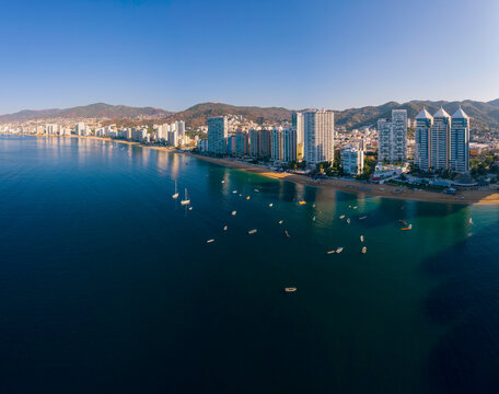 Beautiful sunset, aerial view of the beach, acapulco city seen from above. Travel and vacation concept. Colorful sunset on the beach