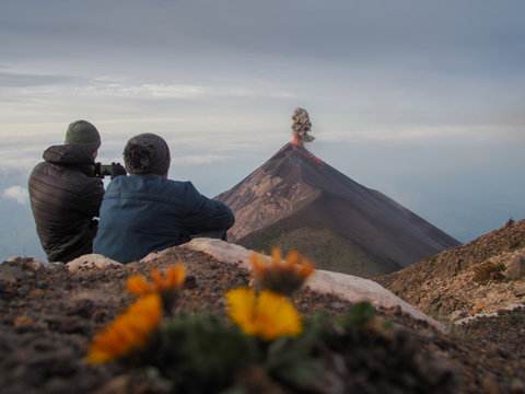 The stunning Volcan de Fuego in Guatemala erupting at sunrise seen from Acatenango Summit