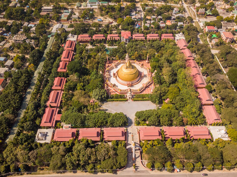 Aerial view of Sitagu international Buddhist accademy surrounded with a beautiful garden, Sagaing Township, Myanmar.