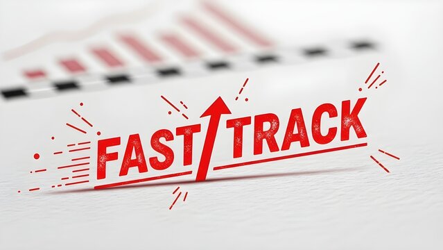 A prominent red Fast Track text with an energetic upward arrow symbolizing accelerated growth and progress over a blurred business chart