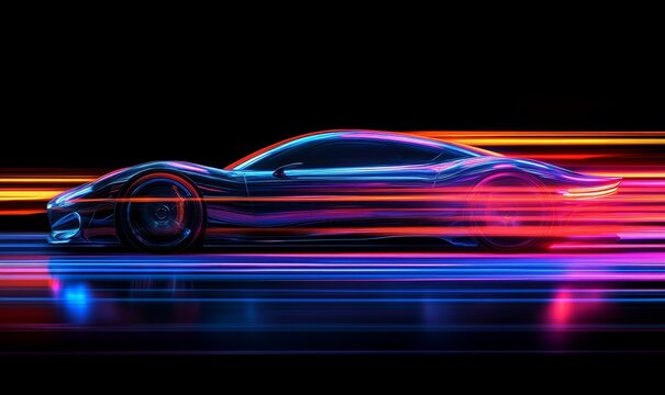 Futuristic Sports Car On Neon Highway. Powerful acceleration of a supercar on a night track with colorful lights and trails. High speed business and technology concept