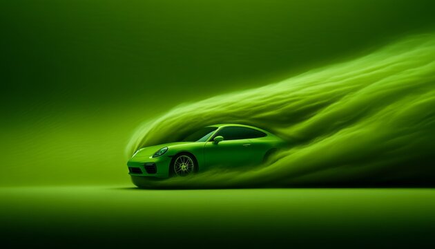 A sleek green sports car speeds off, leaving a trail of swirling greens behind