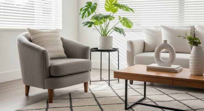 Cozy modern living room interior design featuring a comfortable armchair, stylish sofa, wooden coffee table, green plant, decorative vases, and geometric rug.