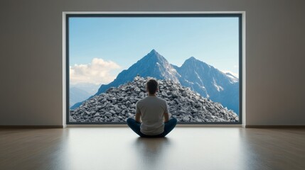 Person sitting in a minimalist room with a mountain of unnecessary things outside the window, symbolizing rejecting clutter