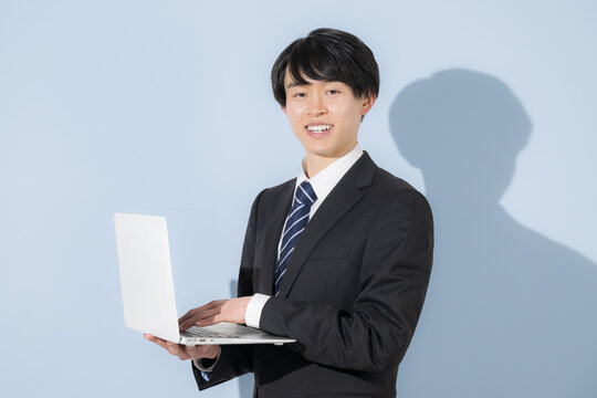 水色背景でパソコンを持つスーツの若い大学生の男性新卒や就職のビジネスイメージ 就活の採用イメージカメラ目線
