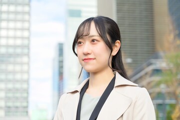 スーツを着てビル街に立つ20代フレッシャーズのビジネスウーマン
