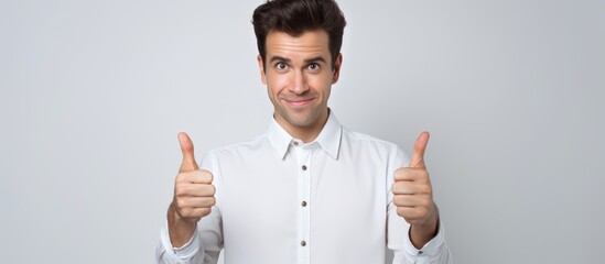 A man wearing a white shirt is standing against a white background, giving a thumbs up gesture. He appears confident and positive.