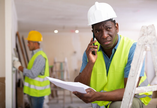 Foreman in yellow vest and protective helmet is talking on mobile phone in a renovated room