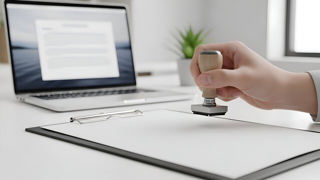 Hand stamping document on clipboard with laptop in background.