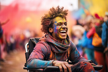 Cheerful young tourist man sitting in a wheelchair at Holi Celebration.