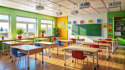A colorful and neatly organized classroom with empty desks, chalkboard, and educational posters on walls, conveying a sense of learning and knowledge.