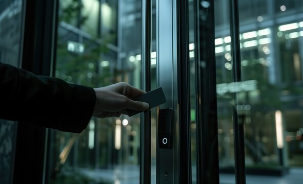 Professional woman swiping keycard, accessing sleek corporate entrance with electronic glass door mechanism