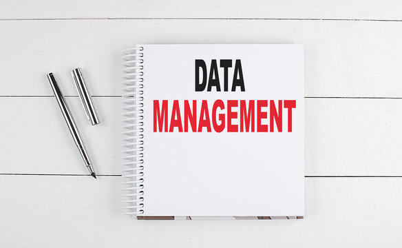 DATA MANAGEMENT text written on notebook on the wooden background