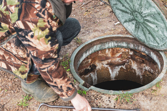 A man opened the septic tank hatch to check the sewer drain level. Septic tanks in a country house