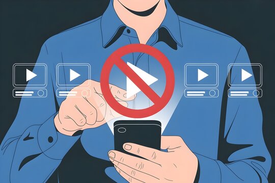 Man holding a smartphone with a video play symbol crossed out concept for censorship and content restriction vector illustration