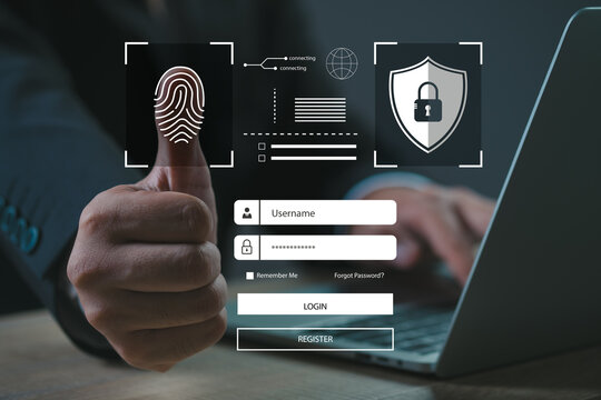 Man using thumb to scan finger print or for access password digital processing biometric identification to access security system includes internet banking, mobile phone , Cyber safety concept.