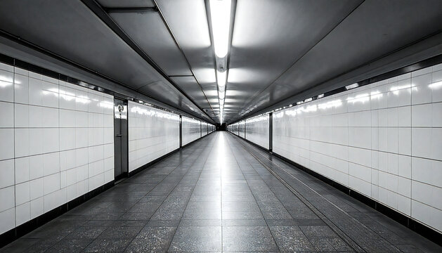 地下鉄の通路。壁が格子状のタイル。A subway passageway. The walls are made of lattice tiles.