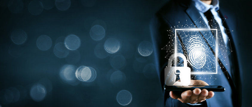 Businessman's  touch screen lock with the most advanced security system to access high-tech systems. cyber security data protection business privacy concept