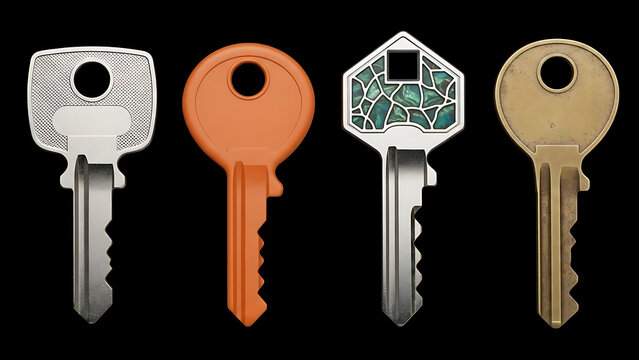 Four keys with unique designs on black background