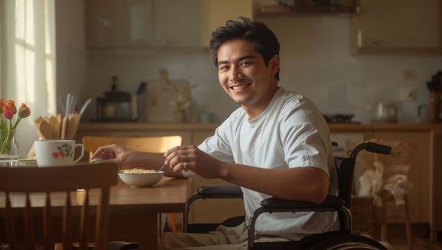 Smiling asian man in wheelchair reaching for cereal at sunlit kitchen table