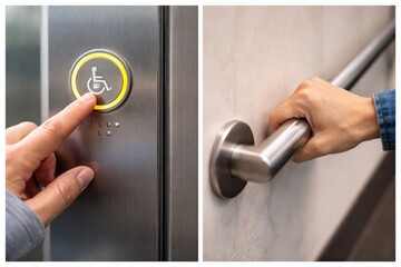 Accessibility Features in an Elevator: Showing Hand on Button to Call for Assistance and Grasping a Handrail for Support