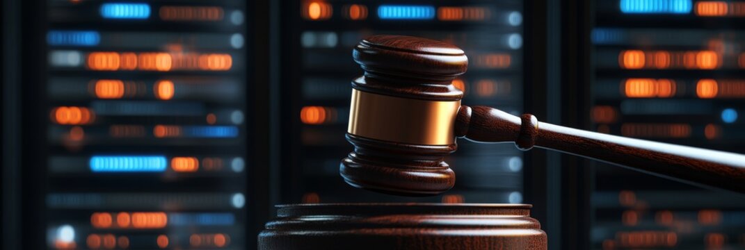 A judicial gavel is prominently placed on a sleek table within a modern AI data center, symbolizing the significant and evolving intersection of law and technology in todays everchanging society