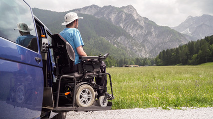 Disabled Man on Wheelchair using Accessible Vehicle with Lift or Ramp in Nature