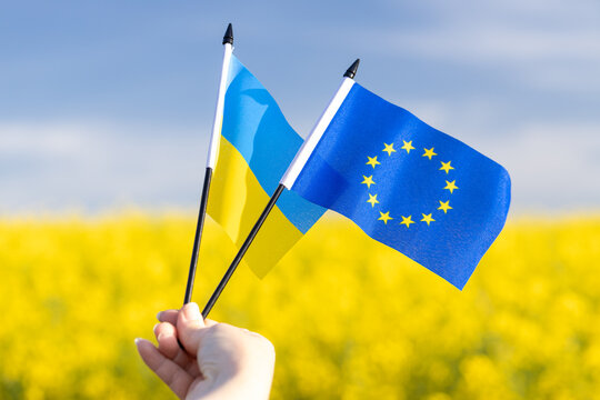 Flags with symbols of the European Union and Ukraine held in a girl's hand, Concept, Acceptance of the Ukrainian candidacy to apply for EU membership