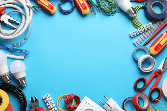 Frame of electrician's tools and accessories on light blue background, flat lay. Space for text