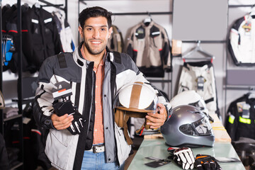 Glad man with helmet is choosing new gloves for motorbike in the store
