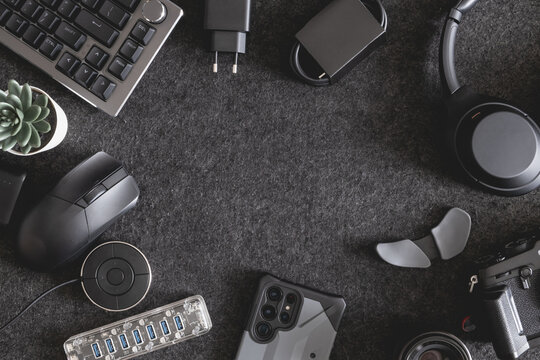 Organized office desk with tech and accessories as workspace essentials