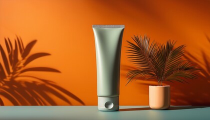sunscreen tube against an orange backdrop accessorized with a small palm tree