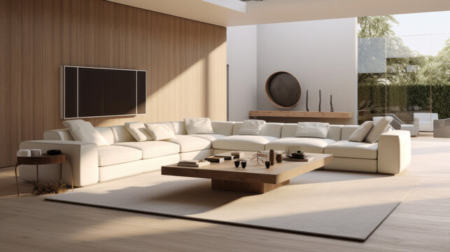 a stylish living room with a white sectional couch and a glass coffee table and a large flat-screen television mounted on the wall