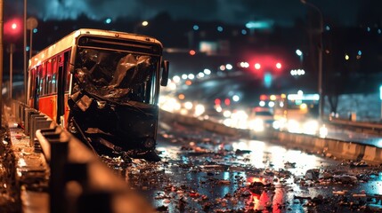 Nightfall Chaos: Bus Crashed on City Street at Sunset, Unveiling the Aftermath of an Accident Scene in the Night.