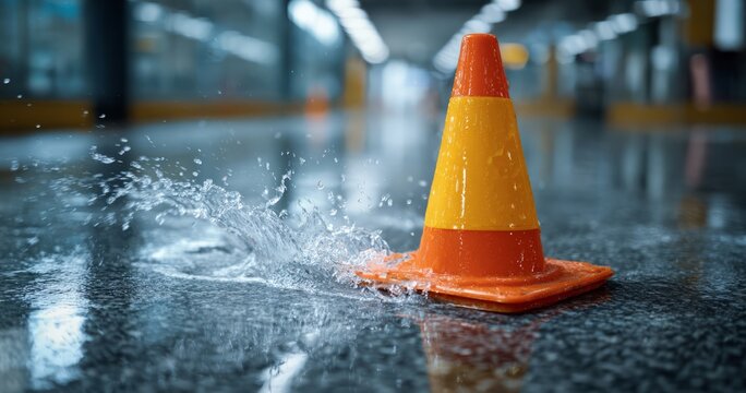 Bright Indoor Scene with Water Splash Near Caution Cone on Wet Floor