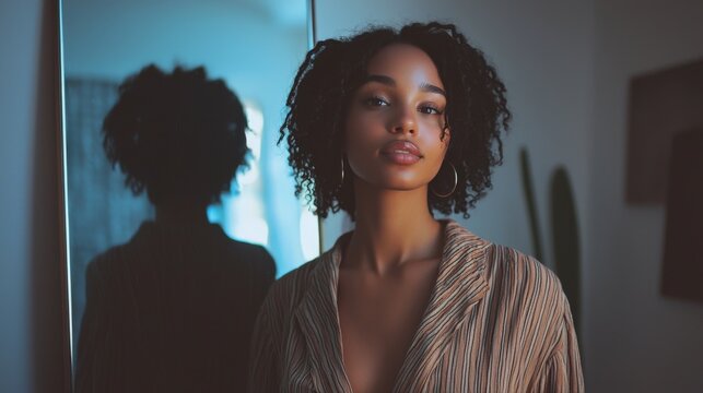A 30-year-old woman stands confidently in front of a mirror,