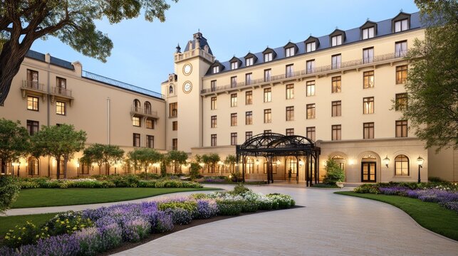 An exquisite hotel's exterior illuminated at dusk with a tranquil swimming pool in the foreground amid lush greenery