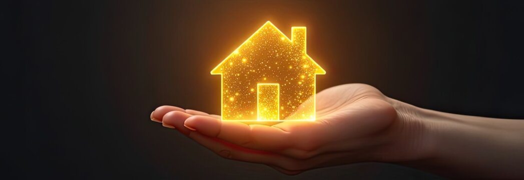 Gold luminous symbol of cozy house In palms of hands with golden glitter. Real estate, realtor, mortgage, insurance, booking, insulation, dream of your own home.