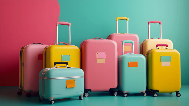 set of matching family suitcases, each one tagged with a different color, ready for a family vacation