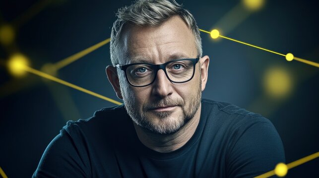 Mature Tech Professional with Glasses Against Digital Network Background