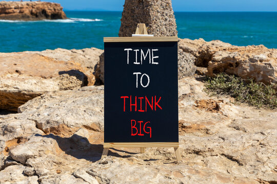 Time to think big symbol. Concept words Time to think big on beautiful black chalk blackboard. Beautiful stone blue sea sky background. Business and time to think big concept. Copy space.