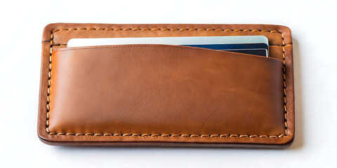 A minimalist brown leather card holder with credit cards inserted, isolated on a white background