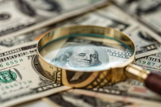 Magnifying glass focusing on a hundred dollar bill, symbolizing financial scrutiny and analysis