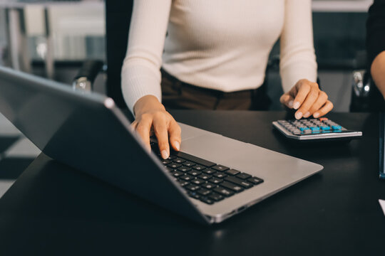 Woman accountant use calculator to calculate the company's financial results with icon banking on data network connection of finance and banking and analytical research, income, tax, business growth