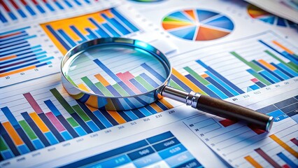 Magnifying glass analyzing financial business charts graphs growth success
