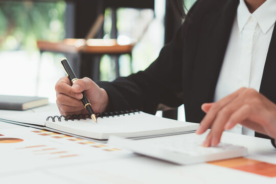 Close up business woman secretary using calculator to do math finance in office with tax accounting statistics research concept.
