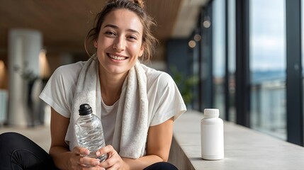 Jeune femme souriante avec serviette apres sport flacon neutre a cote