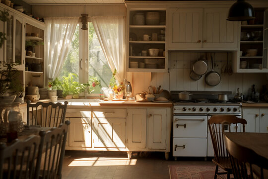 A vintage soft ashen kitchen is lit with sun beams coming in from the left without people present