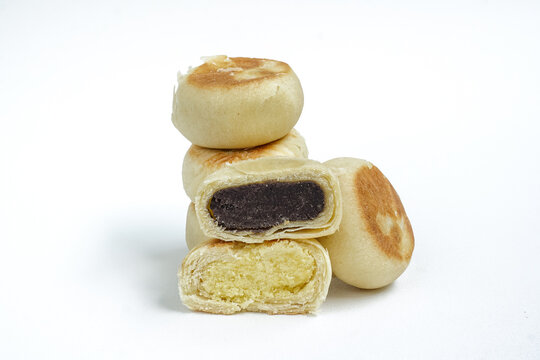 Bakpia is a food and souvenir typical of Yogyakarta made from a mixture of red beans or mung beans or cheese or yam coated with flour. That is an acculturation of Chinese culture. Isolated on white.