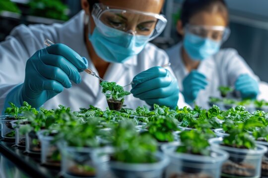 Two scientists, clad in lab coats and masks, focus on plant samples in a laboratory, conducting intricate botanical experiments and scientific research.